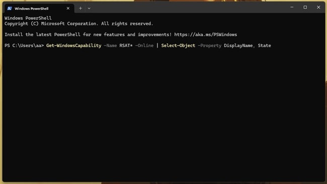 With the PowerShell window open, let’s get a full list of all the RSAT tools that are available (and whether they’re already installed or not). Copy and paste this command into the terminal and press enter..
